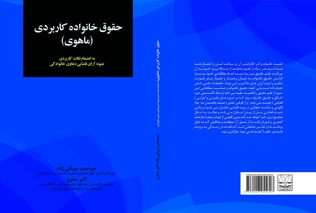 بنابراین مجموعه ای که اینک با عنوان « حقوق خانواده کاربردی » تقدیم می شود ، در کنار مسائل نظری ، دید کاربردی و آزمایشگاه عملی به موضوعات حقوق خانواده دارد و آوردن نمونه های آراء قضایی ضمن فواید آموزشی ، از گذر حقوق نظری به حقوق کاربردی ، ارتباط دهی مطلوب ایجاد نموده تا مطالعه تطبیقی موضوعات حقوق خانواده ( نظری – کاربردی ) ضمن برجسته شدن استدلال و قواعد اعمال شده در رای دادرس در نظر اربابان فضل ، قضات و وکلای محترم نیز افق های تازه ی علمی بگشاید. اینک جلد اول حقوق خانواده کاربردی ( ماهوی ) تقدیم جامعه حقوقی گردیده و موضوعات دادرسی و شکلی دعاوی خانوادگی در جلد دوم در آینده پس از تکمیل به شیوه کاربردی تقدیم خواهد گردید. در پایان این مقدمه ، بر خود واجب می دانیم که از زحمات ارزشمند مدیریت انتشارات قانون یار که همواره با راهنمایی و همکاری های بی بدیل خویش ما را در نشر این اثر یاری نمودند تشکر و قدردانی نماییم.